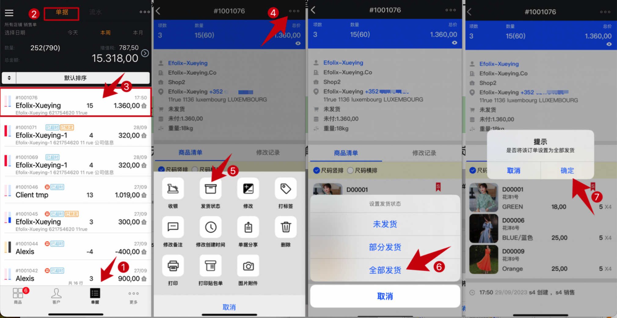 路径:“黑端” → “单据” → “单据”页面 → 选订单 → 右上角“ °°° ” → “发货状态” → “全部发货” → “确定”